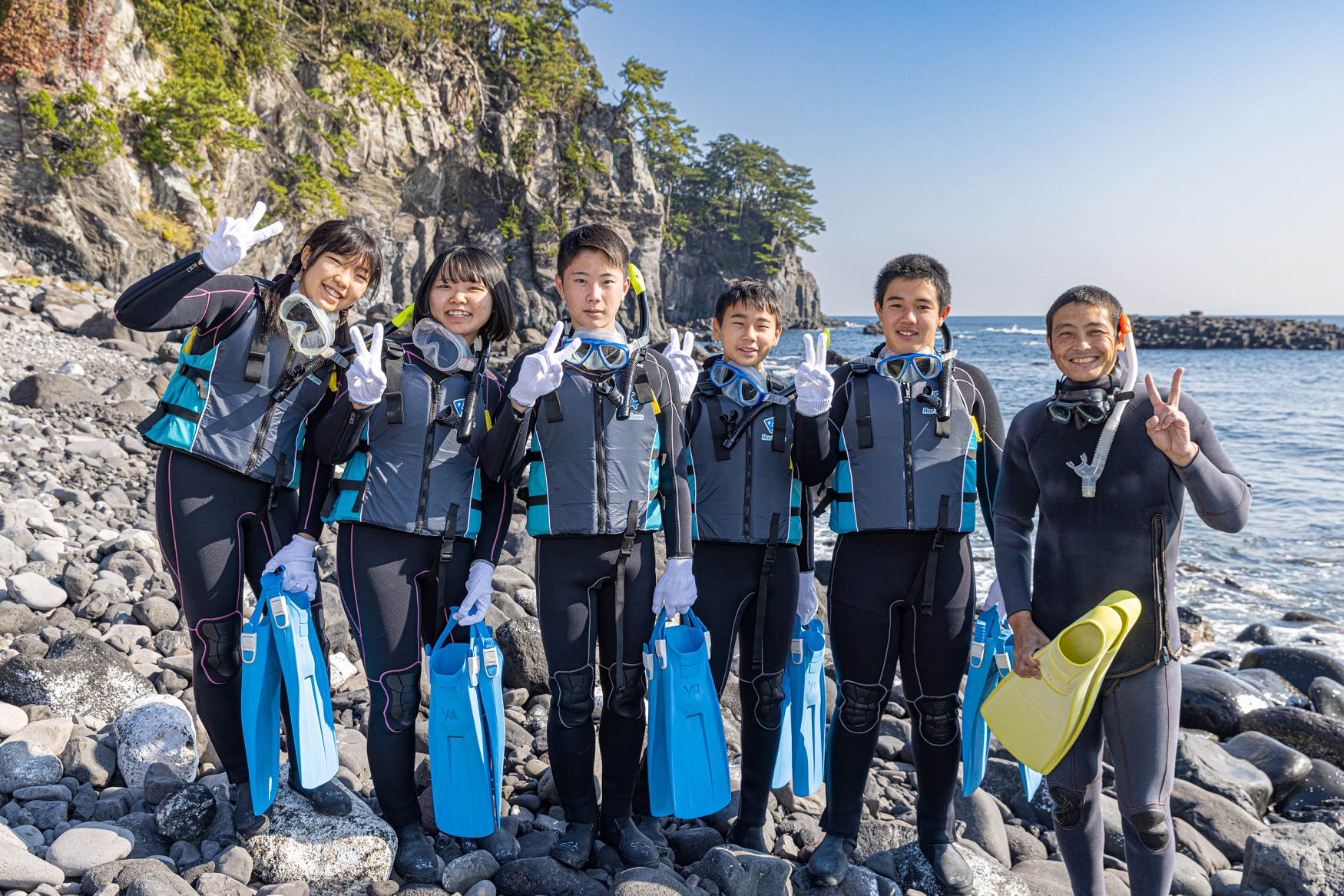 城ケ崎海岸の海でスノーケリングを体験します。