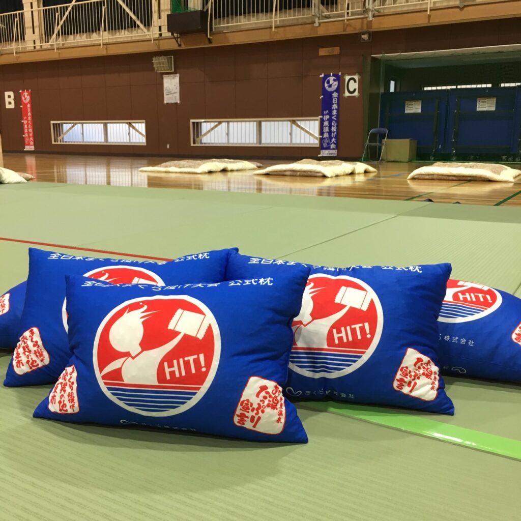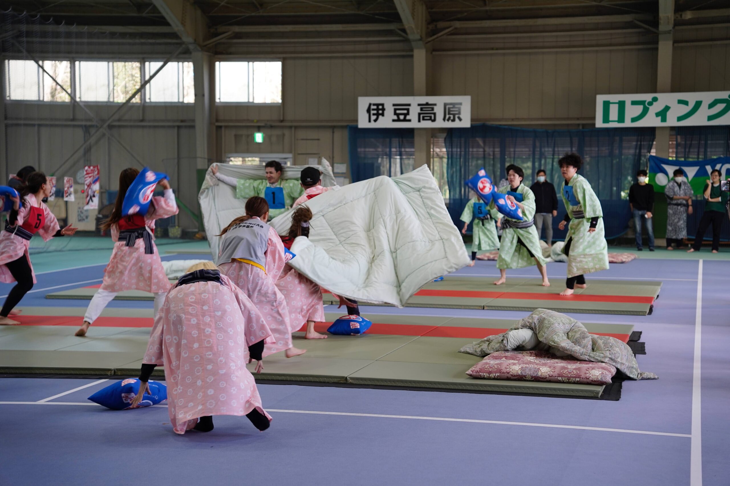 伊東市が発祥のスポーツまくら投げは、誰もが知っているまくら投げを厳格なルールのもと競技性を高め、全国大会が開催される文化として定着してきました。相手の大将を就寝させた(アウトにした)チームが勝ち。ポジションや戦い方を事前学習し、実践を通じてチームビルディングを効果的に行うことができるスポーツです。